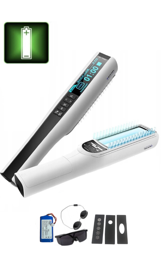 - Lampa UVB przeznaczona jest do terapii skóry głowy oraz trudno dostępnych miejsc, a także po zdjęciu grzebienia nadaje się do naświetlenia wszystkich części ciała: pachwin, dłoni, stóp, goleni itd.