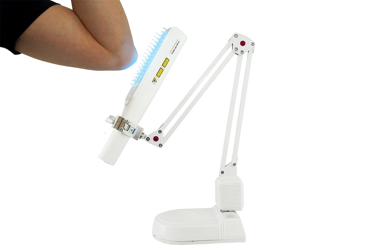 - Używanie lampy dermatologicznej z grzebieniem - grzebień używany do naświetleń skóry głowy jest dystansem. Włosy nie są przygniatane podczas naświetleń dzięki temu światło UVB dochodzi do skóry głowy. Przy naświetlaniu skóry głowy szyba przed świetlówką jest zabezpieczeniem przed dotykaniem włosów o świetlówkę, która się rozgrzewa. Takie zabezpieczenie wpływa korzystnie na kondycje włosów. Naświetlenia lampą z zamontowanym grzebieniem realizuje się z 3 cm przykładając grzebień do skóry, a wartość natężanie promieniowania UVB dla tej odległości wynosi 4,5mW/cm2.