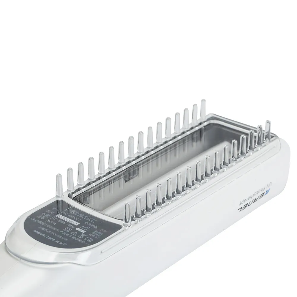 - Lampa UVB przeznaczona jest do terapii skóry głowy oraz trudno dostępnych miejsc, a także po zdjęciu grzebienia nadaje się do naświetlenia wszystkich części ciała: pachwin, dłoni, stóp, goleni itd.